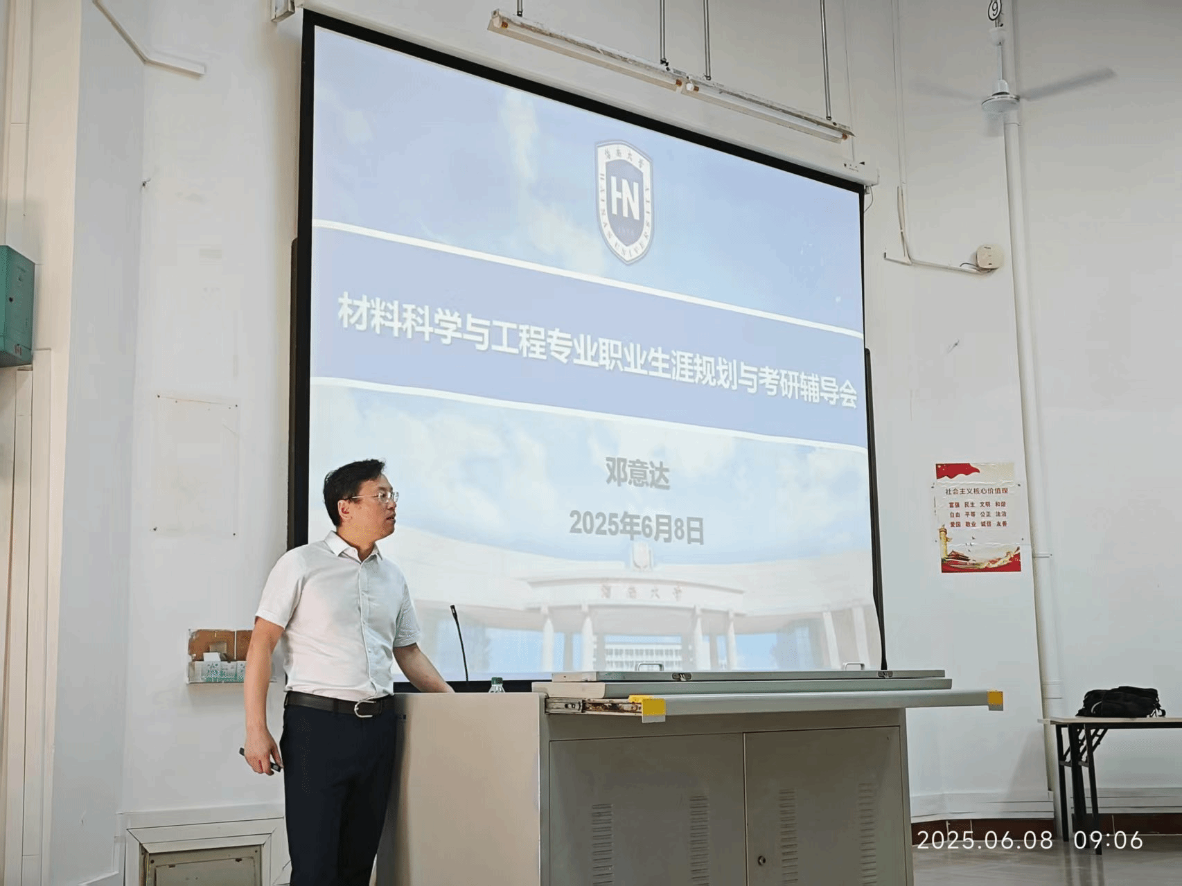 2025年6月8日上午,材料科学与工程学院在2教108教室举办面向2024级材料专业同学的职业生涯规划与考研动员活动。本次活动由材料科学与工程专业责任教授邓意达教授主讲,2024级材料科学与工程专业全体同学及班主任参与。