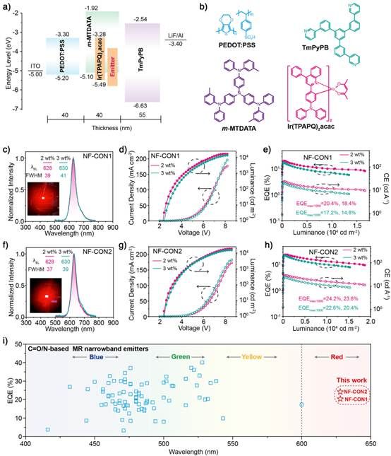 基于溶液加工法制备的OLED器件展现了优异的电致发光性能。以NF-CON2为发光材料的器件在628 nm处发出纯红色光,半峰宽仅为37 nm,色度坐标达到(0.665, 0.333)。器件性能方面,NF-CON2器件实现了24.2%的最大外量子效率,在1000 cd m-2亮度下保持23.8%的高效率。这是首例电致发光峰超过600 nm且半峰宽小于40 nm的纯红色C=O/N多重共振OLED器件。