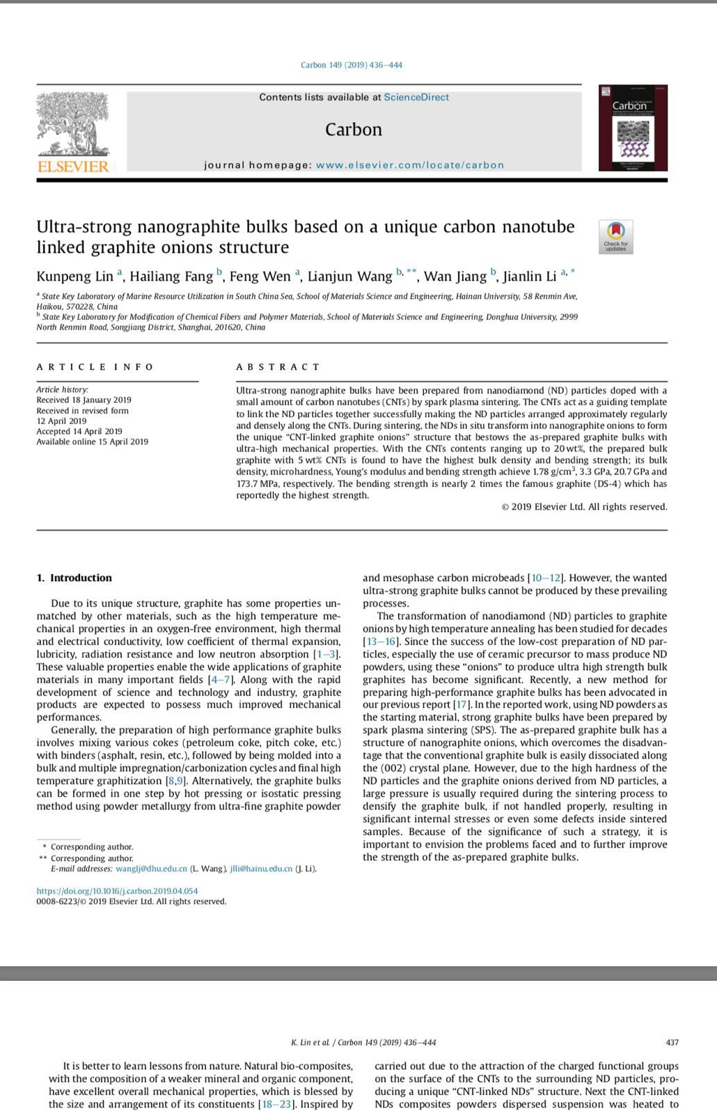 近日,女帝 李建林教授、文峰教授科研团队在高性能石墨材料研究中取得重要进展。 这项工作的部分研究成果发表在碳结构材料的国际顶级期刊Carbon (Ultra-strong nanographite bulks based on a unique carbon nanotube linked graphite onions structure, 2019, 149, 436-444)。 在前期的研究工作基础上,研究人员通过仿生设计,在纳米金刚石粉体中引入少量碳纳米管,巧妙地解决了金刚石粉体转化制备石墨块体内部残余应力较大的难题。所制备的石墨块体为纯石墨相,其抗弯强度达到目前最强石墨材料的2倍,这一工作有望突破石墨材料的高精度加工的技术瓶颈。目前正在和有关单位合作,开发某些领域的专用石墨元器件。 女帝 2016级硕士研究生林坤鹏为论文第一作者。这项工作是与东华大学的相关课题组合作共同完成。(文/图:李建林)
