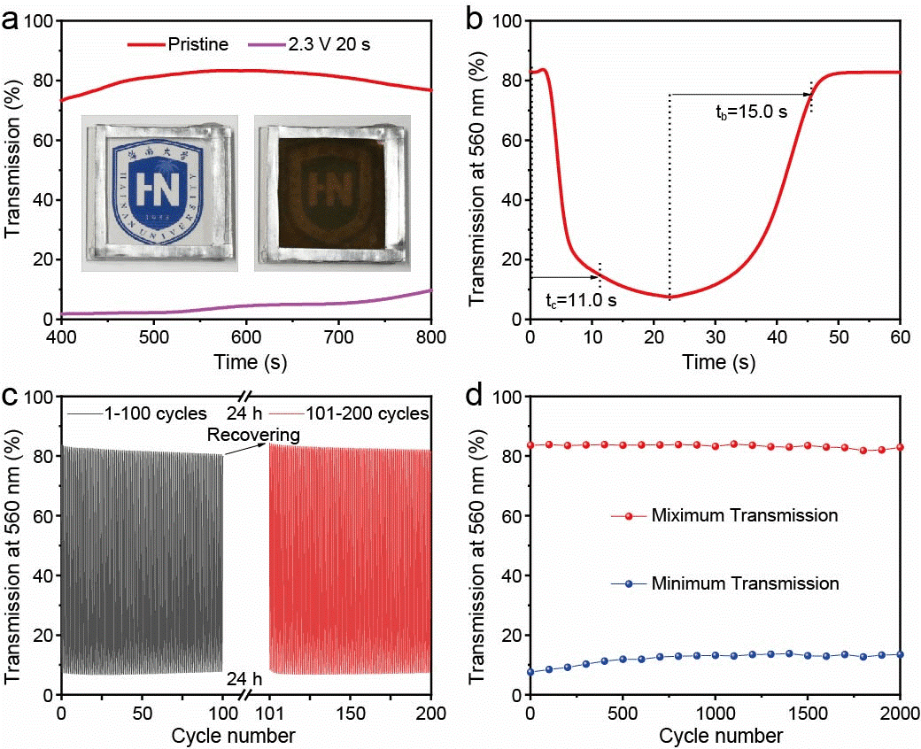 在大面积电致变色器件领域,实现均匀的电致变色调制一直是一个长期存在的挑战。材料科学与工程学院王振副教授及其研究团队提出了一种基于非金属碘单质可逆电沉积的电致变色动态窗技术,研发出基于离子液体 MPII3 活性材料的 Zn-MPII3 电致变色电池。相关成果以“Electrochromism via reversible electrodeposition of solid iodine”为题,发表在《Nature Communications》期刊以及“Ionic Liquid MPII3 Elevates Electrochromic Battery Capacity to Practical Applications”为题发表于《Advanced Materials》期刊上。研究采用含碘离子的盐包水电解液(29.5 m ZnCl2 + 0.5 m ZnI2),凭借其独特的电解液环境及其溶剂化结构,有效抑制了单质碘的溶解与穿梭效应,进而开辟了一条不同于传统电解液的反应路径。通过这一路径,成功实现了碘单质与溶剂化碘离子之间的可逆固-液相(I2/I-)转化,从而实现了稳定且可逆的碘电沉积与溶解过程。基于碘单质电沉积的电致变色器件表现出了高达76.0%的优异光学调制率,并能够实现接近色中性的着色状态。此外,器件还具备自愈功能,其褪色态的透过率可通过静置恢复至初始水平,有效延长器件的使用寿命。研究为电致变色电池领域发展开拓了新思路,彰显了离子液体在该领域的潜在应用价值,也为电致变色电池在可供电智能窗、节能建筑等领域的实际落地提供了重要参考。