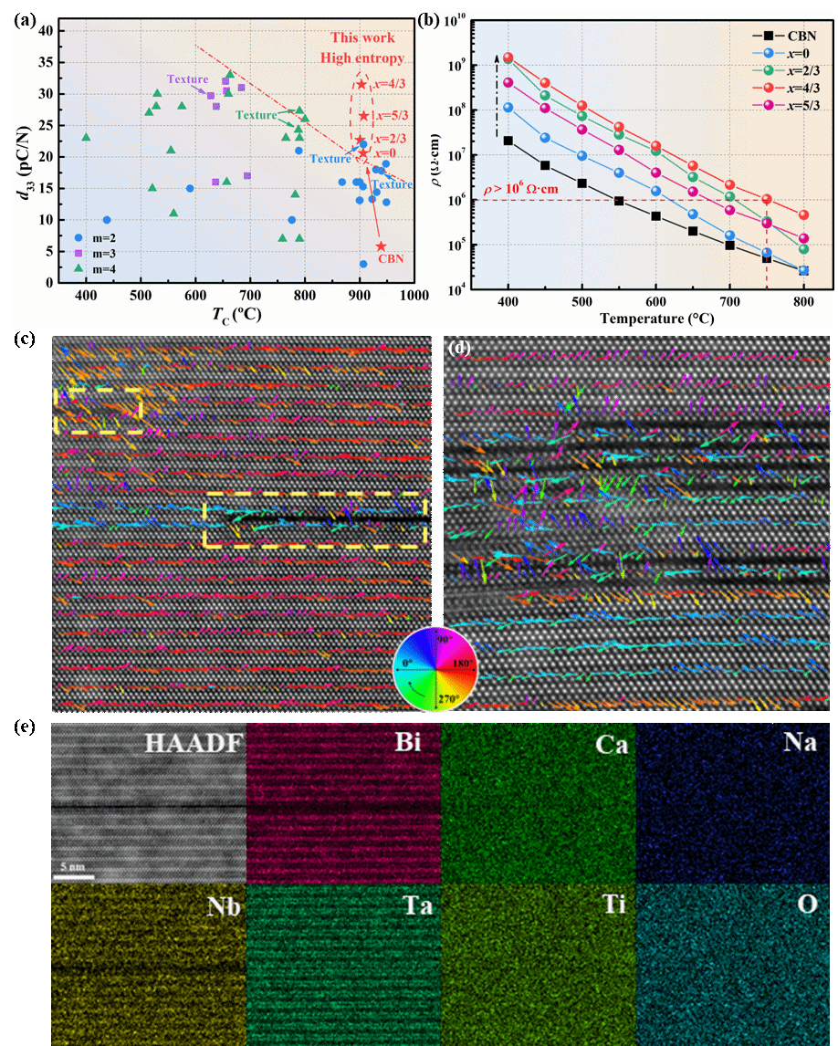 祁核教授继在《Nature Reviews Materials》发表高熵铁电体相关评论文章后,在先进压电与储能陶瓷研究领域取得系列重要突破,相关成果分别发表于《Advanced Materials》和《Nature Communications》。团队率先将高熵策略引入高温压电陶瓷设计,在 CaBi2Nb2O9基体中引入异质原子创制新型高熵高温压电陶瓷,实现居里温度 900℃以上、压电系数 d33 提升至 30 pC/N 以上,750℃高温下电阻率仍大于 1.0×106 Ω・cm,综合电学性能优于已报道铋层状结构高温压电陶瓷;该研究揭示高熵效应可诱导材料形成高密度二维非晶态缺陷,打破传统铋层状材料极化维度限制,构建独特局域极化构型,同时通过晶粒与电畴纳米化提升电阻率,实现压电、绝缘、温度稳定性的协同优化。此外,团队还将熵调控策略引入反铁电材料领域,通过极化构型设计、核 - 壳结构调控等方式,分别实现反铁电材料储能密度与效率的协同提升,创制出兼具优异储能性能的弛豫反铁电陶瓷,相关成果为高温压电器件和高性能储能陶瓷的理性设计提供了全新思路与技术路径。