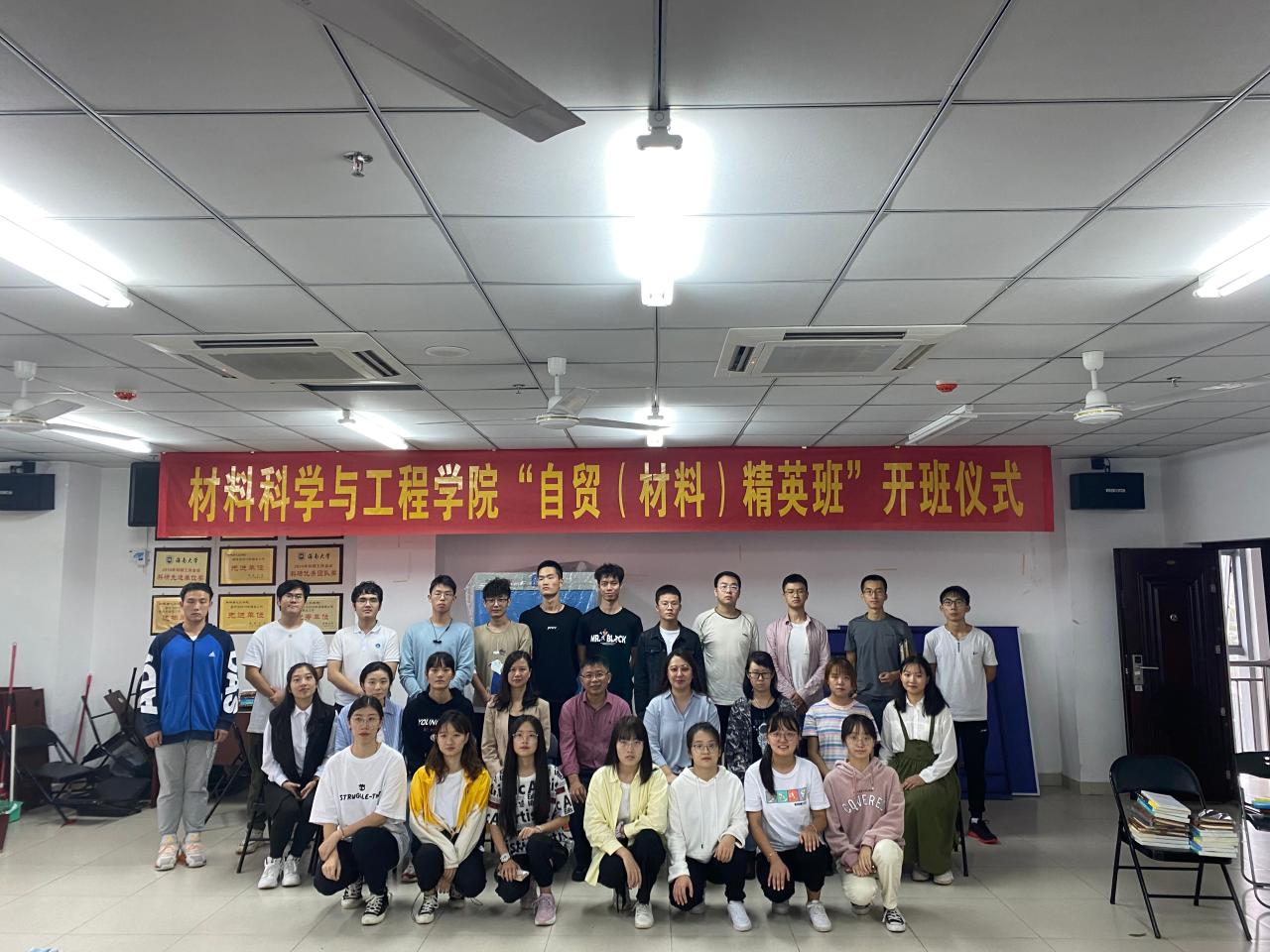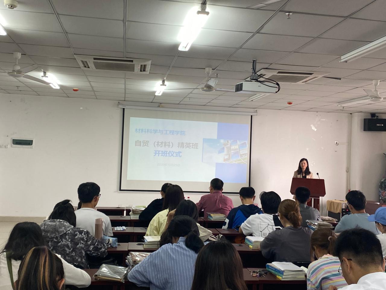 2020年10月25日下午,材料科学与工程学院首届“自贸(材料)精英班”开班仪式在研发中心710会议室举行。学院党委副书记胡先文、分管学生工作副处级辅导员周郭军、学工办负责人郎筱宇及“自贸(材料)精英班”全体学员参加了开班仪式。