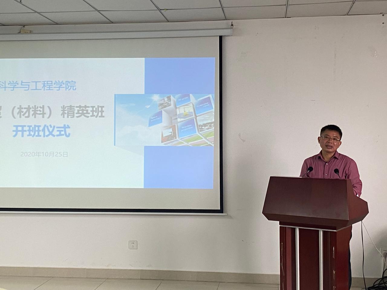 仪式伊始,为使“自贸(材料)精英班”的同学对所在班级有更深入的了解,副处级辅导员周郭军就自贸班的人才培养方案、该班成立的目的、意义及今后如何更好地开展班级工作等做了系统的介绍。