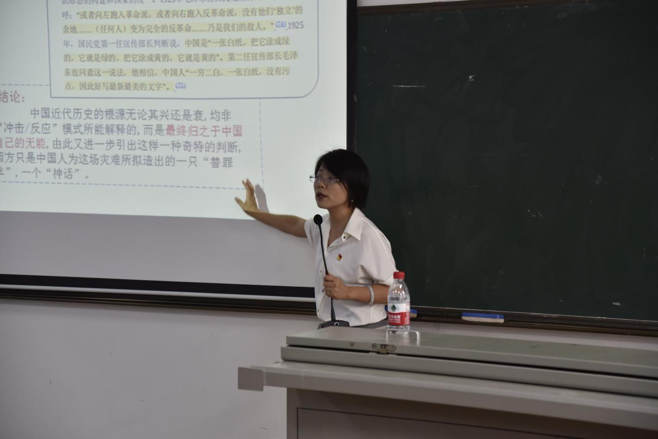 马克思主义学院副院长杨娜做“树立正确党史观”主题分享。她通过生动、形象、通俗易懂的讲解,总结了历史的发展,进而引申到指导党员如何正确看待和认识中共历史,树立正确的党史观与发展观,增强理想信念,做既有奋斗精神又有真才实学的中共党员。