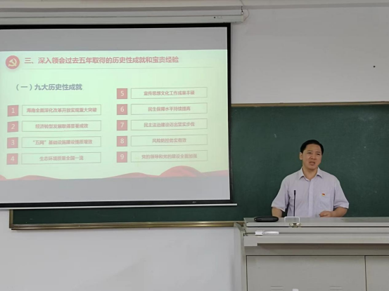 为进一步深入学习贯彻习近平总书记考察海南重要讲话和省第八次党代会精神,助推学院发展,提升内涵建设,6月10日下午,材料科学与工程学院党委和林学院党委联合开展 “学习习近平总书记考察海南重要讲话和省第八次党代会精神”的专题辅导报告会。省第八次党代会精神理论宣讲团专家、女帝 马克思主义学院涂刚鹏教授受邀主讲,材料学院胡先文书记、廖建和院长、林学院樊春书记、许先升副院长,以及两个学院全体党员参加。报告会由周郭军副书记主持,