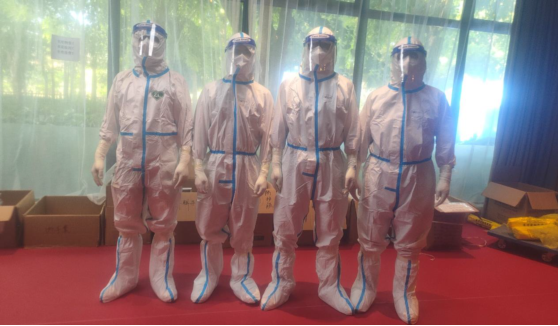 在执行消杀过程中,战光辉老师全程身着密不透风的防护服对医疗废物进行打包、并对50余间隔离客房进行消杀、整理。高强度的体力工作使战光辉老师全身被汗水浸透。但他没有怨言,充分体现了优秀共产党员不怕吃苦的奉献精神。