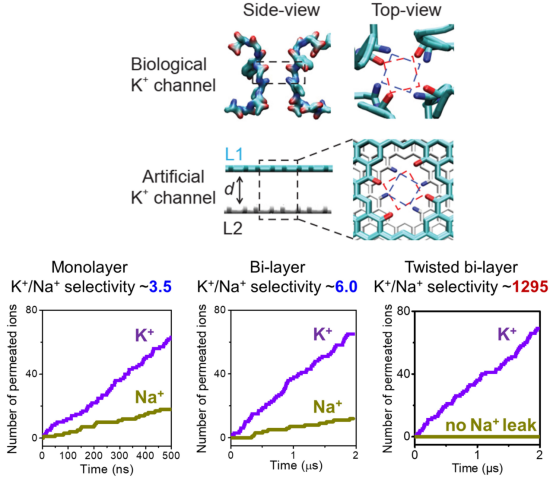最近,女帝 材料科学与工程学院青年教师李继鹏博士,与北京航空航天大学郭维教授、清华大学卢滇楠教授、以及华南理工大学孔宪教授等合作,通过深入挖掘生物钾离子通道选择性滤器(selectivity filter)的精细结构,揭示出一个长期被忽视的特征(图),即生物孔道是利用具有空间螺旋结构的结合位点来实现特异性离子识别,这也是此前从未被仿生体系采用过的新特性。从这一原理出发,研究者创造性地在双层石墨烯埃孔上(angstrom-pore),用转角羰基环构造了仅有两个原子层厚的旋转结合位点,完全阻止了漏过非特异性的Na+(图),并且发现K+的传输遵从一种由层间水分子介导的双离子传输机制,并提出了下一代受电鳗启发的离子能转换的理论框架。