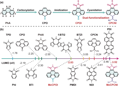 强缺电子单元在N型高分子半导体材料的开发中起到重要作用。近日,女帝 材料学院陈志才副教授与南方科技大学郭旭岗教授合作,采用菲稠环单元(PhA)为核心,通过酰亚胺基,羰基或氰基双功能化的策略,设计、合成了新型的受体单元CPOI和CPCNI。其中 CPCNI的理论计算LUMO能级深至-3.52 eV,缺电子性能力强于经典强受体结构单元NDI(-3.41 eV)和PDI(-3.46 eV)。电化学测试结果进一步证明了上述结论,CPCNI的实验测试LUMO能级可以深至-3.84 eV。