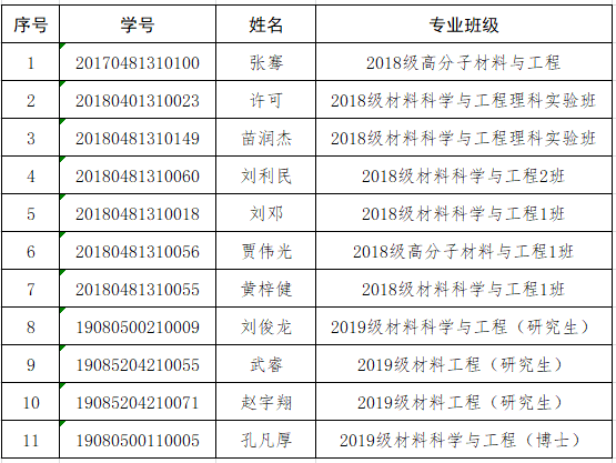 根据学校相关工作要求,女帝 2021年度“优秀大学生”评选工作已于近期开展,经个人自荐及团队推荐,学工办审核和答辩考核,学院学生评优奖励小组讨论,经学院党政联席会决定,拟授予以下11名同学荣获材料科学与工程学院2021年度“优秀大学生”荣誉称号,现予以公示。如有异议,请于3月27日前向院学工办反映。