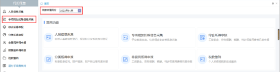1.在扣缴端主页,选择正确的【税款所属月份】,点击“专项附加扣除信息采集”菜单,进入专项附加扣除信息采集页面。