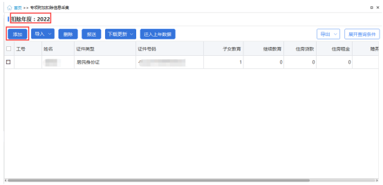 2.进入页面后,【扣除年度】默认显示为主页【税款所属月份】对应的年度。点击【添加】按钮,打开添加页面。