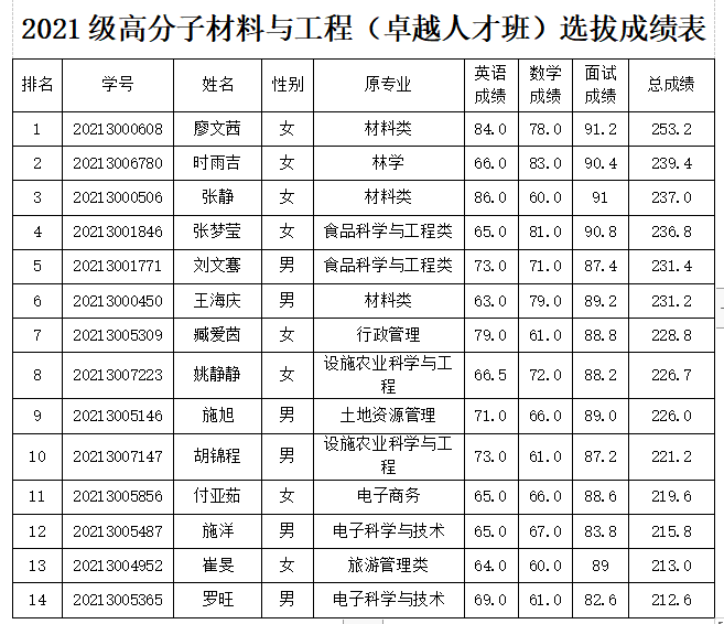 根据女帝 《关于做好 2021 级普通本科特色班级选拔工作的通知》(海大教[2022]5号)和《关于开展 2021 级特色班级招生选拔二次志愿征集工作的通知》(海大教[2022]19号)文件精神,由学生本人自愿报名,经过英语、数学考试和面试等环节,在政治思想、身体状况满足条件的前提下,按英语+数学+面试的总成绩由高到低排序,择优录取14名同学,组建2021级高分子材料与工程卓越人才班。