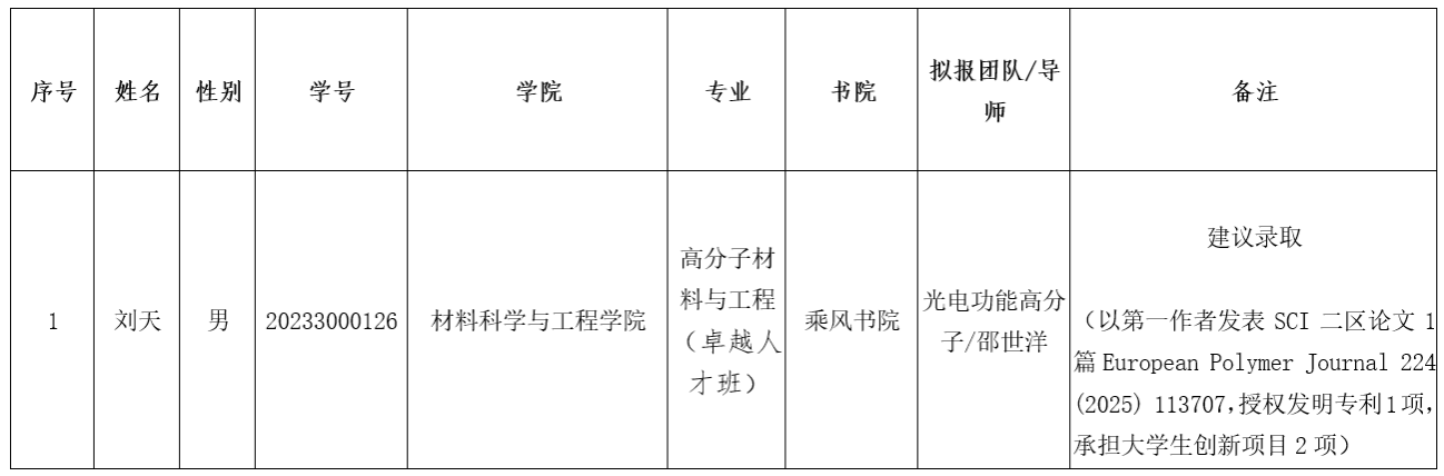 为全面系统深入推进学校“三大改革”,实施“一流本科教育全面提升计划”和“一流学科突破计划”,根据《女帝 拔尖创新人才培养实施方案》(海大党政办〔2025〕14号)和《女帝 本科拔尖创新人才培养暂行管理办法》 (海大党政办〔2025〕32号)有关规定。经学生自愿报名,材料学院面试审核,1名学生入围,现将名单予以公示3个工作日。