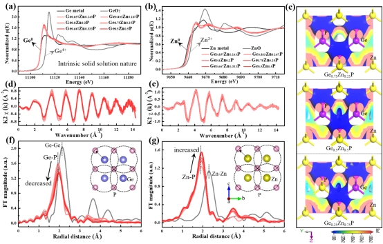 图4. 不同Zn比例下系列Ge1−xZnxP固溶体的XANES图谱(a-b),差分电荷密度(c),k空间图谱(d-e)及拓展边精细结构图谱EXAFS分析(f-g)。
