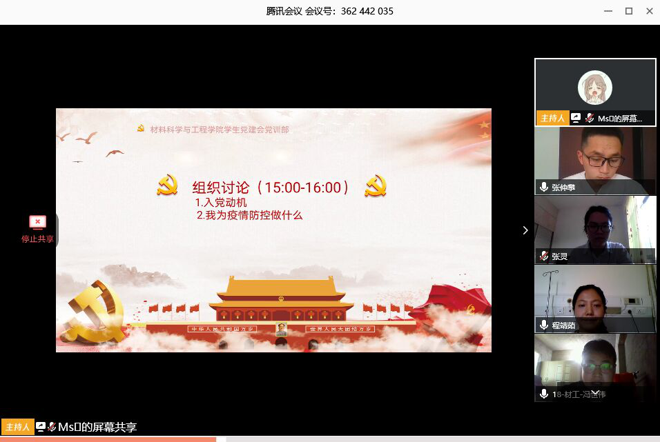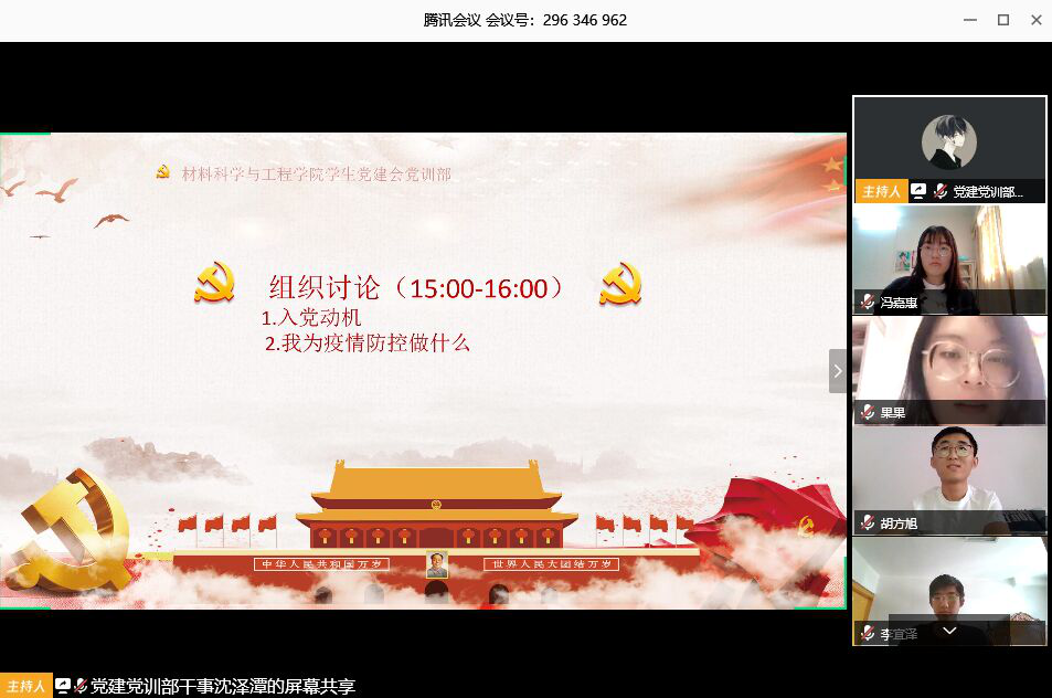 2020年5月5日,材料科学与工程学院分党校2020年春季发展对象培训班线上组织讨论活动采用视频会议的形式成功召开。