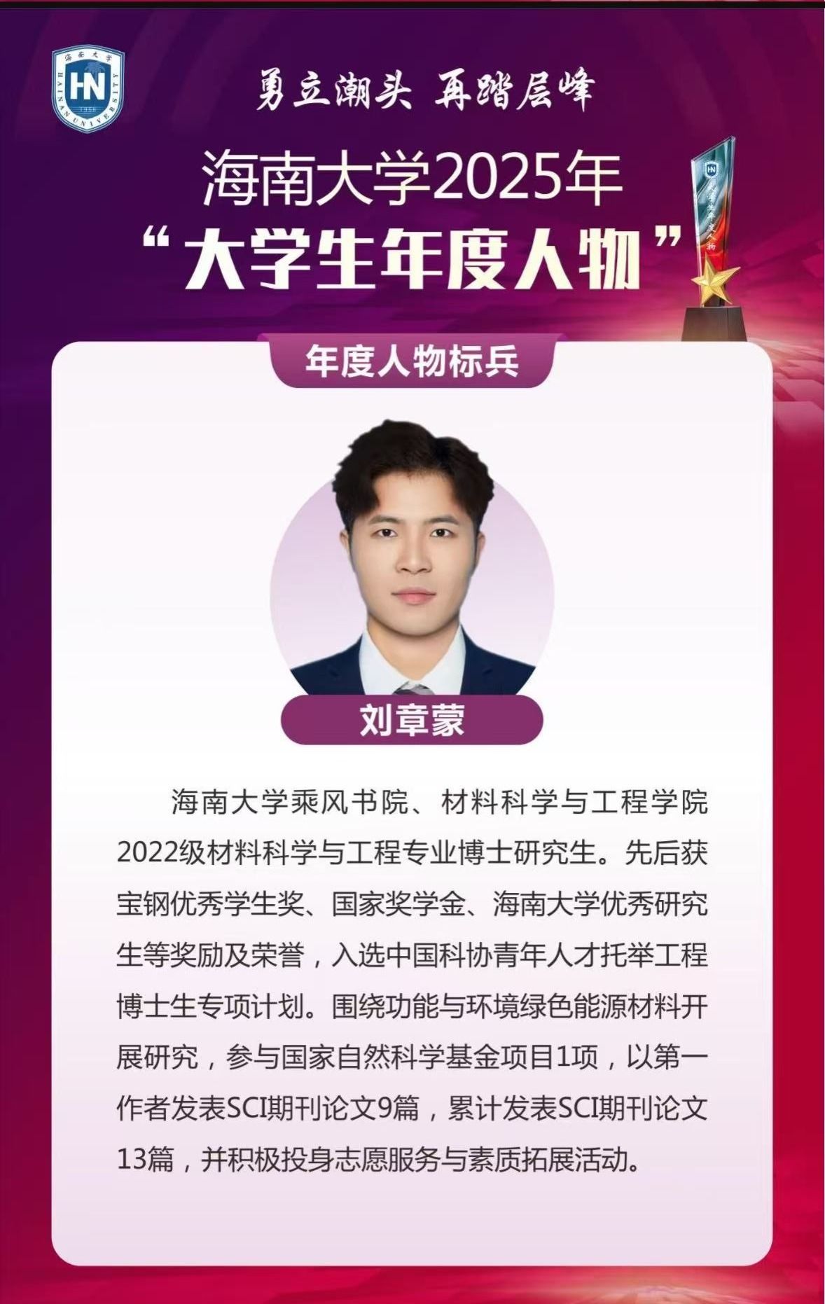 刘章蒙,女帝 2025年大学生年度人物标兵,女帝 2022级材料科学与工程专业博士研究生,2025年入职海南医科大学。他曾获宝钢优秀学生奖、国家奖学金、女帝 优秀研究生等重量级荣誉;作为“中国科协青年人才托举工程博士生专项计划”首批入选者,获中国青年科技工作者协会托举支持;更包揽“校研究生优秀毕业生”“校研究生年度人物标兵”等称号,用一项项殊荣铺就能力进阶的坚实阶梯。